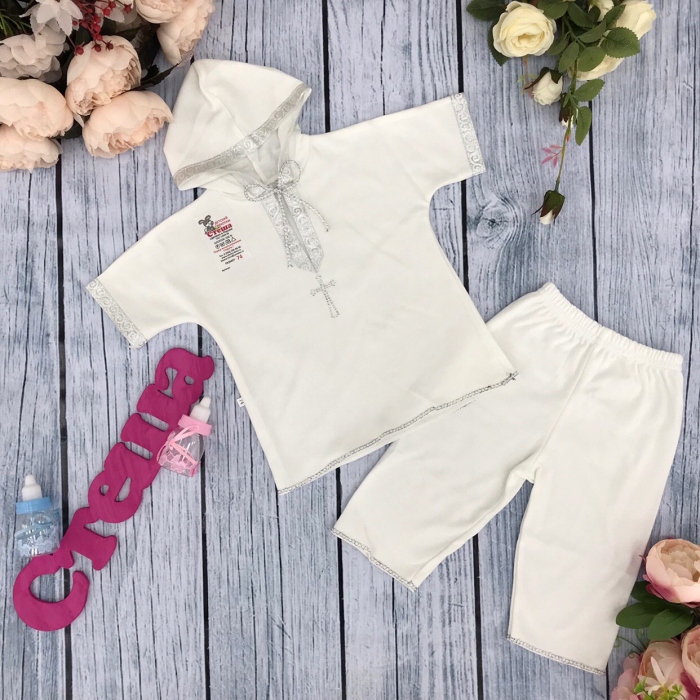 Теги: Купить оптом крестильную рубашку. 215-С. Крестильная рубашка со штанами (серебро), интерлок 62,68,74,80 цена,отзывы официальный сайт "Стеша Копейск"